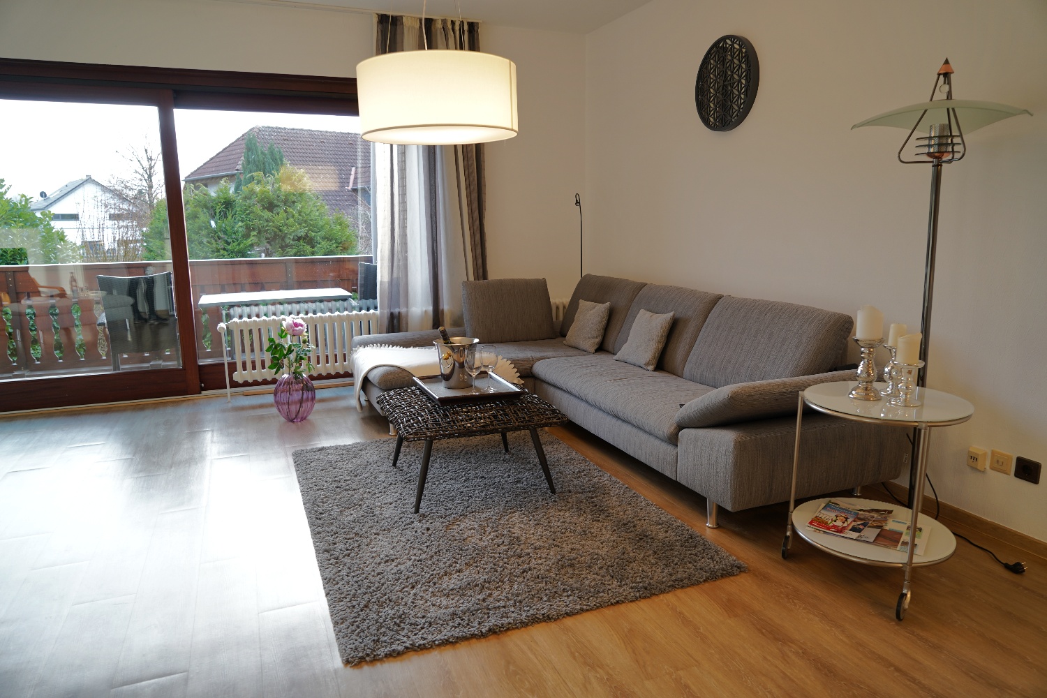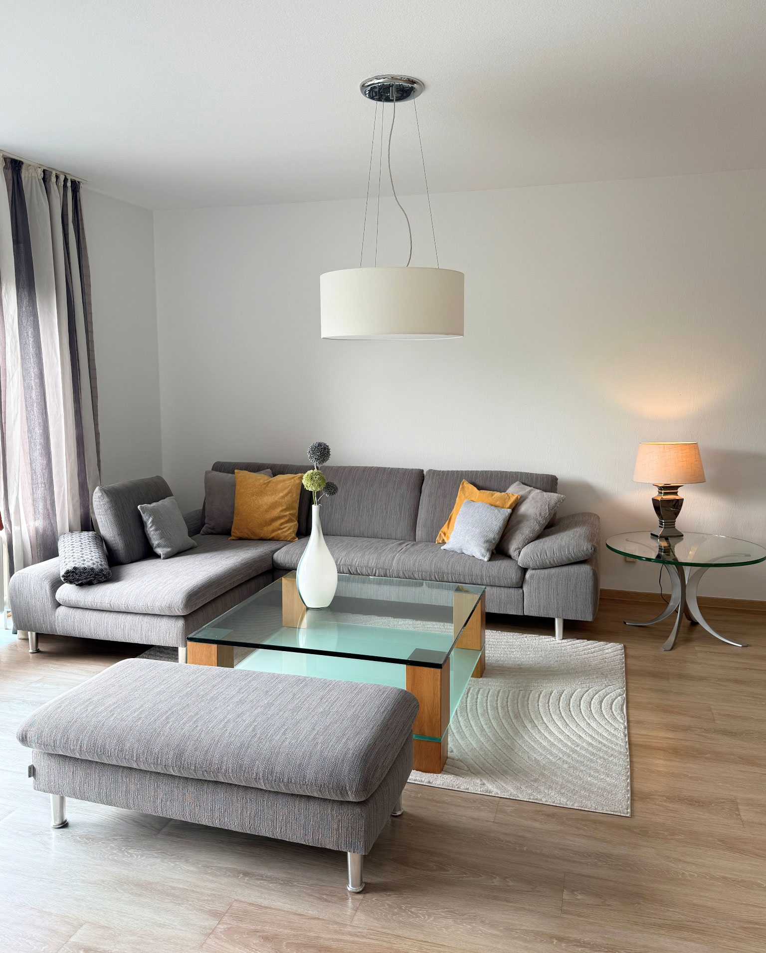 Der helle Wohnbereich mit gemütlicher Lounge und direktem Zugang zum südseitigen Balkon mit Blick ins Grüne lädt zum Verweilen ein. Auch das freundliche Schlafzimmer mit eigenem Balkon schafft Raum zum Durchatmen und Wohlfühlen.