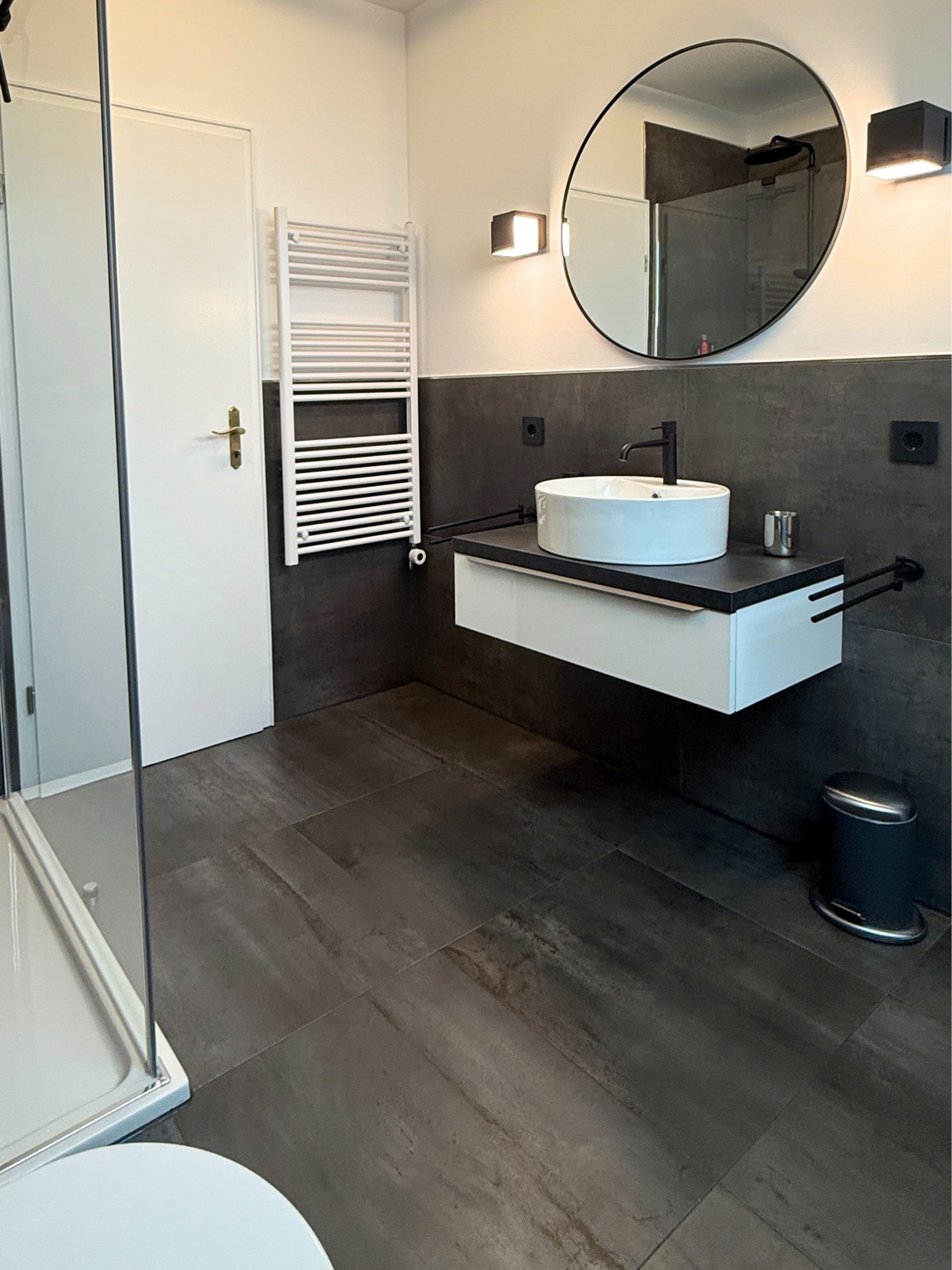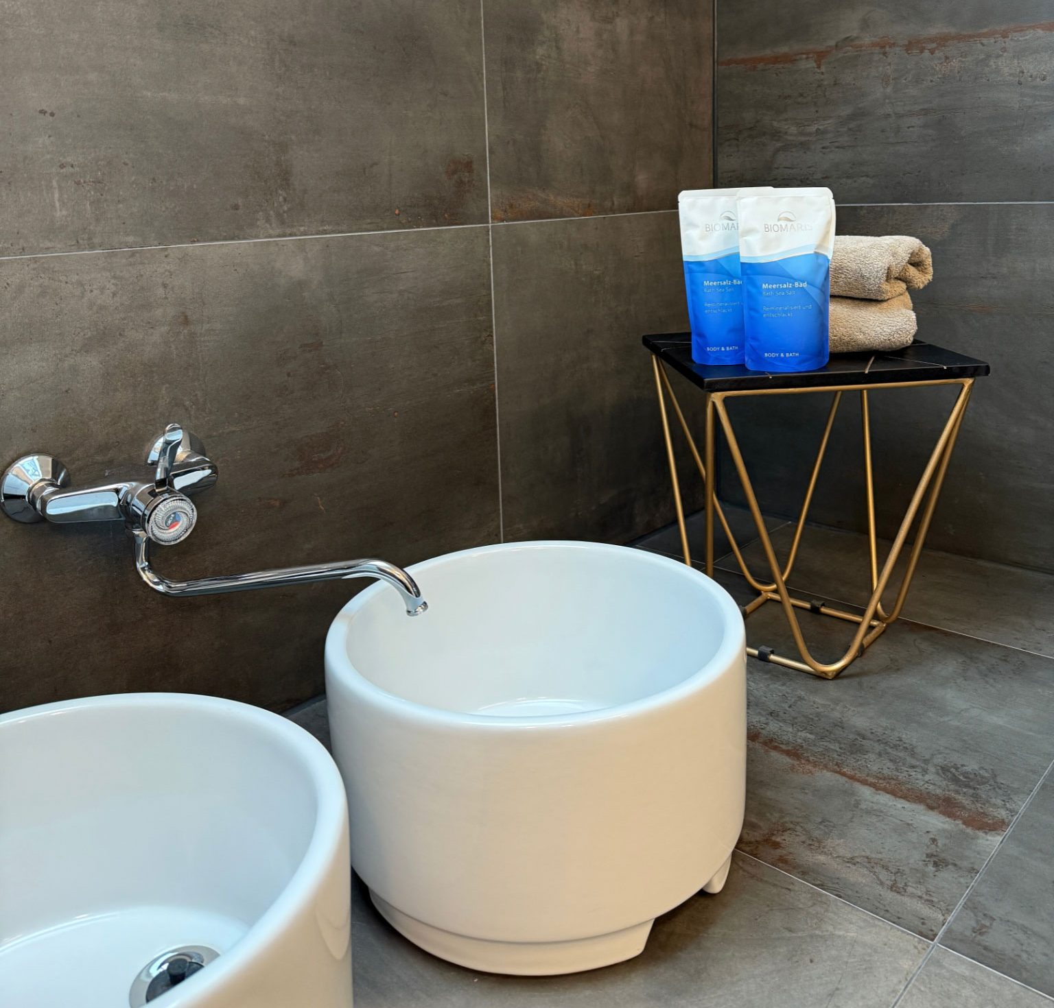 Ein besonderes Detail: das in das Bad integrierte Fußbecken. Ob nach einem Spaziergang durch den Kurpark oder einer Fahrradtour – hier finden müde Füße wohltuende Erleichterung.
